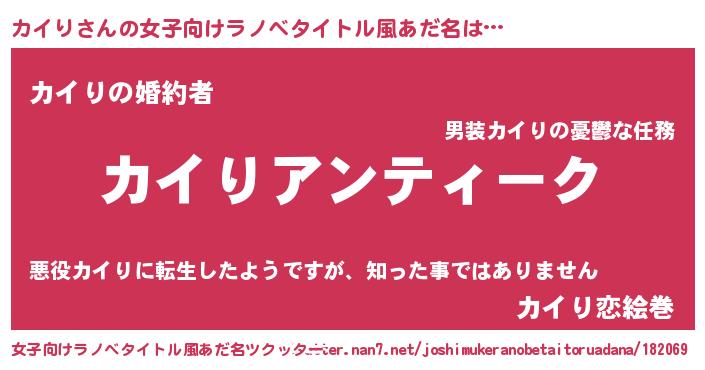 カイりさんの女子向けラノベタイトル風あだ名は… 『カイりアンティーク』『カイりの婚約者』『カイり恋絵巻』 ツクッター #女子向けラノベタイトル風あだ名ツクッター http://tkutter.nan7.net/joshimukeranobetaitoruadana/182069/
