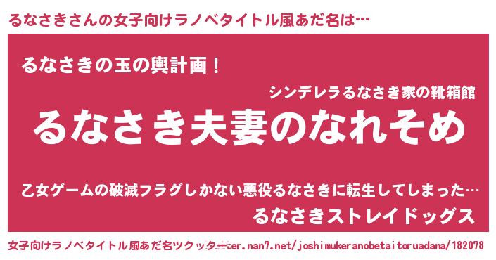 | 男性向けラノベタイトル風あだ名 | 『おまえをオタクにしてやるから、俺をるなさきにしてくれ! 』 |