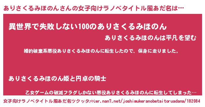 | 胡散臭い通販商品みたいなあだ名 | 『絶対に幸福をもたらす水素水…その名も「ありさくるみほのん」』 |