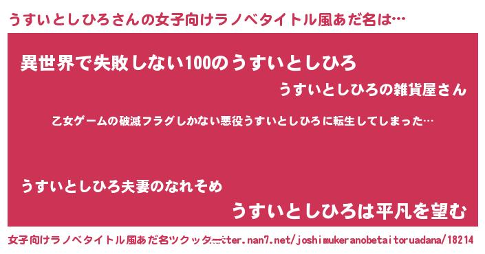 | 男性向けラノベタイトル風あだ名 | 『この素晴らしい世界にうすいとしひろを!』 |