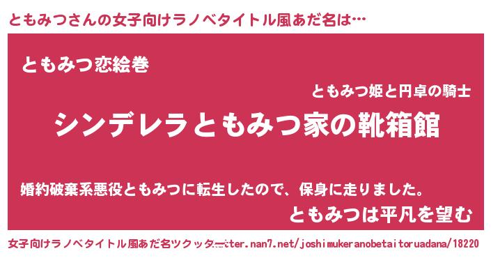 | 男性向けラノベタイトル風あだ名 | 『緋弾のトモミツ』『ともみつの憂鬱』 |