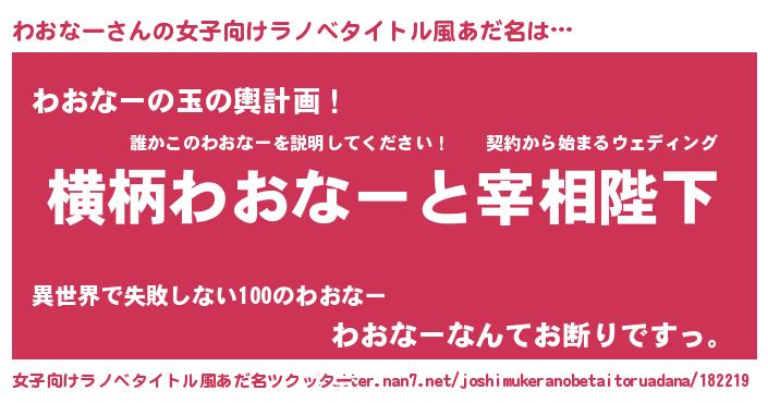 | 男性向けラノベタイトル風あだ名 | 『わおなーに滅ぼされるだけの簡単なお仕事です』 |