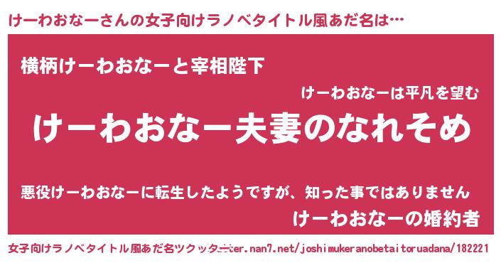 | 男性向けラノベタイトル風あだ名 | 『おまえをオタクにしてやるから、俺をけーわおなーにしてくれ! 』 |