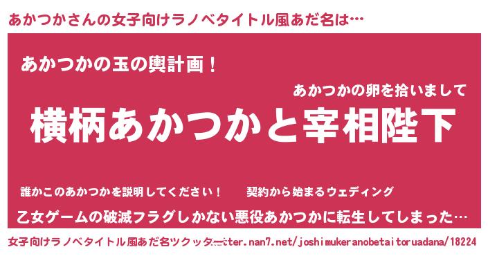 | 男性向けラノベタイトル風あだ名 | 『あかつかに滅ぼされるだけの簡単なお仕事です』 |
