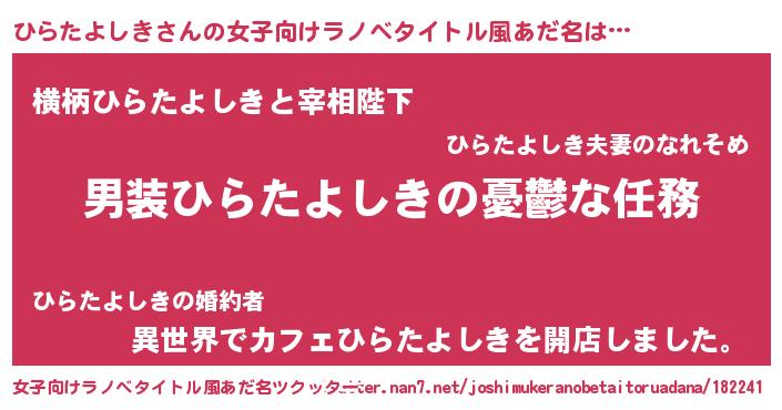 | 男性向けラノベタイトル風あだ名 | 『うちのひらたよしきが世界を掌握している!』 |