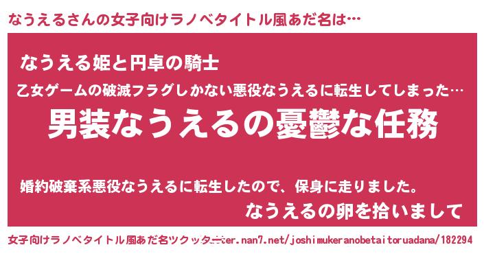 | 男性向けラノベタイトル風あだ名 | 『うちのなうえるが世界を掌握している!』 |