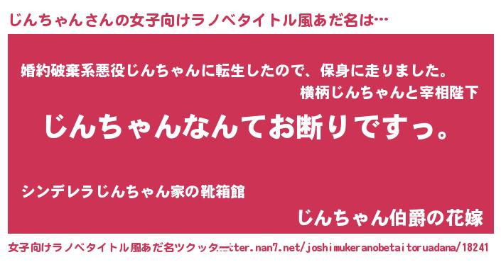 じんちゃんさんの女子向けラノベタイトル風あだ名は… 『じんちゃんなんてお断りですっ。』『婚約破棄系悪役じんちゃんに転生したので、保身に走りました。』『じんちゃん伯爵の花嫁』 ツクッター #女子向けラノベタイトル風あだ名ツクッター http://tkutter.nan7.net/joshimukeranobetaitoruadana/18241/