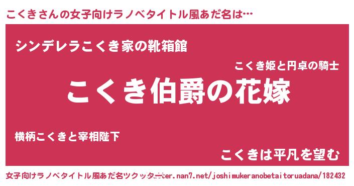 こくきさんの女子向けラノベタイトル風あだ名は… 『こくき伯爵の花嫁』『シンデレラこくき家の靴箱館』『こくきは平凡を望む』 ツクッター #女子向けラノベタイトル風あだ名ツクッター http://tkutter.nan7.net/joshimukeranobetaitoruadana/182432/