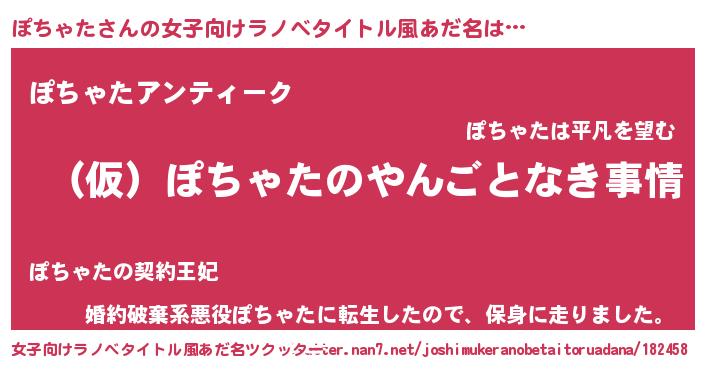 | 男性向けラノベタイトル風あだ名 | 『ぽちゃたの憂鬱』『ポチャタスレイヤー』 |