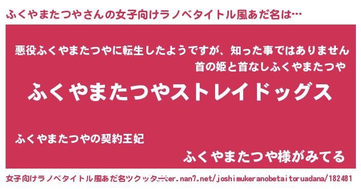 | 男性向けラノベタイトル風あだ名 | 『Re:ふくやまたつやから始める異世界生活』 |