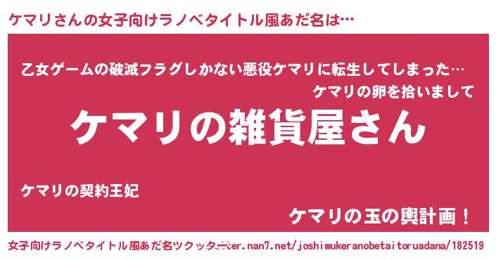 ケマリさんの女子向けラノベタイトル風あだ名は… 『ケマリの雑貨屋さん』『乙女ゲームの破滅フラグしかない悪役ケマリに転生してしまった…』『ケマリの玉の輿計画!』 ツクッター #女子向けラノベタイトル風あだ名ツクッター http://tkutter.nan7.net/joshimukeranobetaitoruadana/182519/