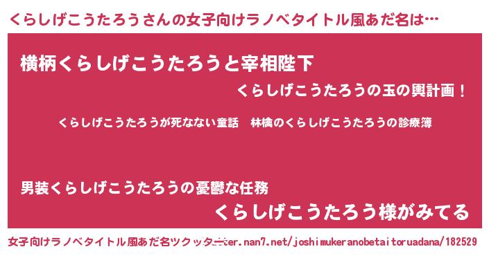 | 男性向けラノベタイトル風あだ名 | 『魔弾の王とくらしげこうたろう』 |