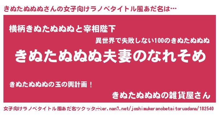 | 男性向けラノベタイトル風あだ名 | 『おまえをオタクにしてやるから、俺をきぬたぬぬぬにしてくれ! 』 |