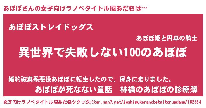 | 男性向けラノベタイトル風あだ名 | 『あぼぼという概念が存在しない退屈な世界 』 |