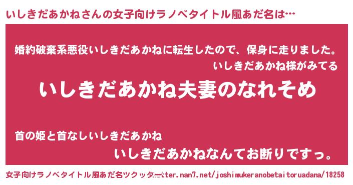 | 男性向けラノベタイトル風あだ名 | 『おまえをオタクにしてやるから、俺をいしきだあかねにしてくれ! 』 |