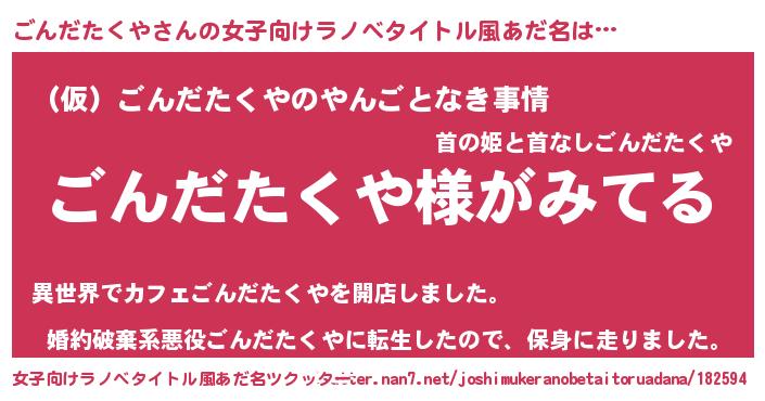 | 男性向けラノベタイトル風あだ名 | 『ごんだたくやの嫁は女の子じゃないと思った?』 |