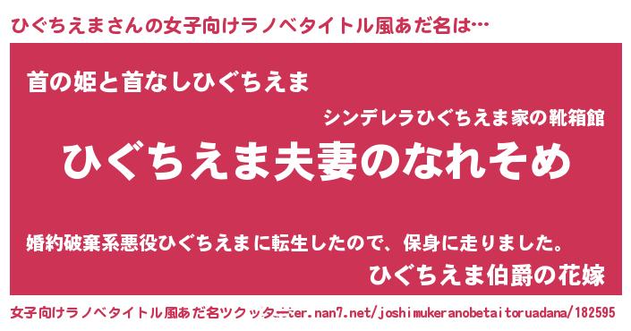 | 男性向けラノベタイトル風あだ名 | 『おまえをオタクにしてやるから、俺をひぐちえまにしてくれ! 』 |