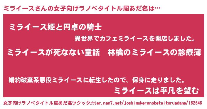 | 男性向けラノベタイトル風あだ名 | 『魔弾の王とミライース』 |
