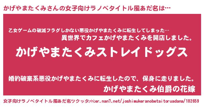 | 男性向けラノベタイトル風あだ名 | 『Re:かげやまたくみから始める異世界生活』 |