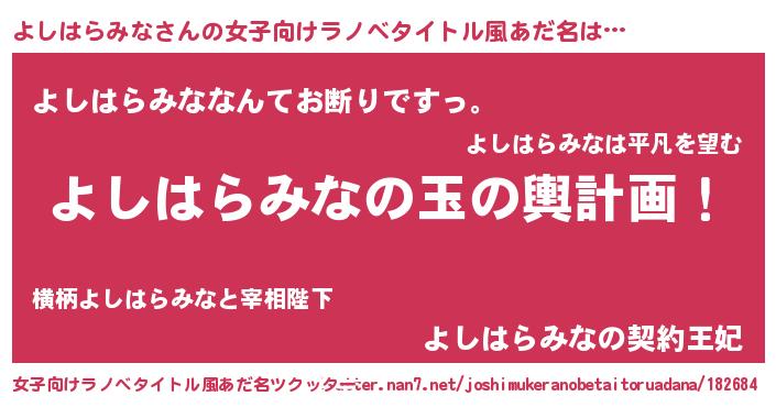 | 男性向けラノベタイトル風あだ名 | 『よしはらみな~年齢イコール彼女いない歴の魔法使い~』 |
