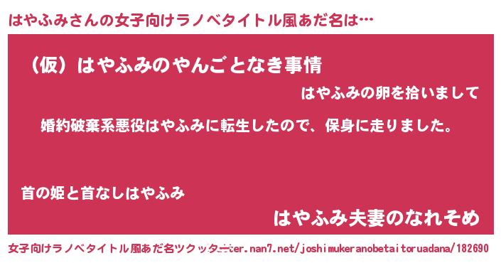 | 男性向けラノベタイトル風あだ名 | 『転生したらはやふみだった件』 |