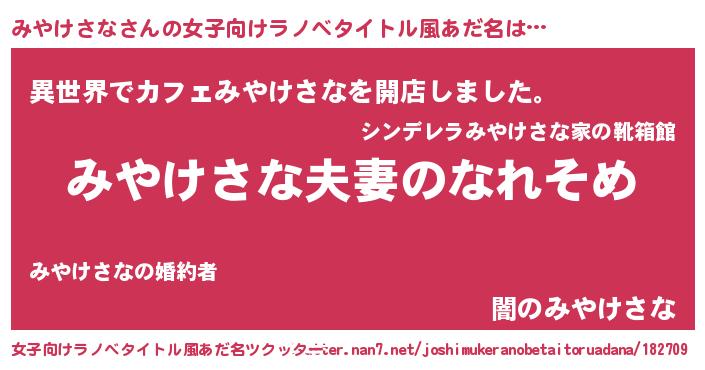 | 男性向けラノベタイトル風あだ名 | 『おまえをオタクにしてやるから、俺をみやけさなにしてくれ! 』 |