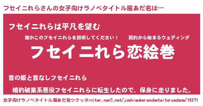 | 男性向けラノベタイトル風あだ名 | 『おまえをオタクにしてやるから、俺をフセイニれらにしてくれ! 』 |