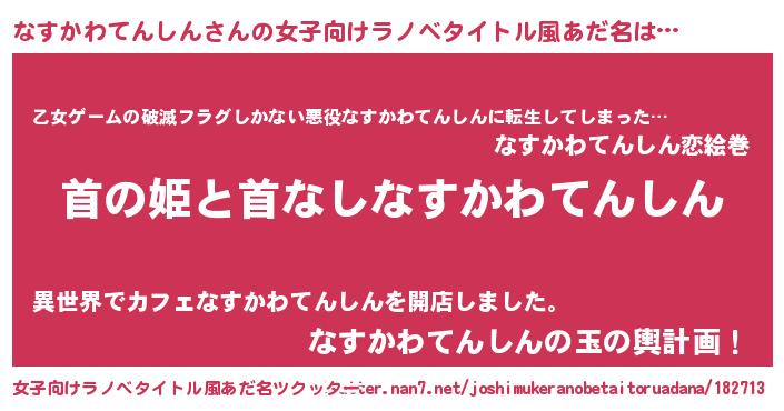 | 男性向けラノベタイトル風あだ名 | 『はたらくなすかわてんしんさま!』 |