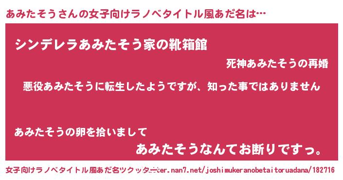 あみたそうさんの女子向けラノベタイトル風あだ名は… 『悪役あみたそうに転生したようですが、知った事ではありません』『シンデレラあみたそう家の靴箱館』『あみたそうなんてお断りですっ。』 ツクッター #女子向けラノベタイトル風あだ名ツクッター http://tkutter.nan7.net/joshimukeranobetaitoruadana/182716/