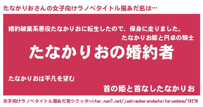 | 男性向けラノベタイトル風あだ名 | 『うちの娘の為ならば、俺はもしかしたらたなかりおも倒せるかもしれない。』 |