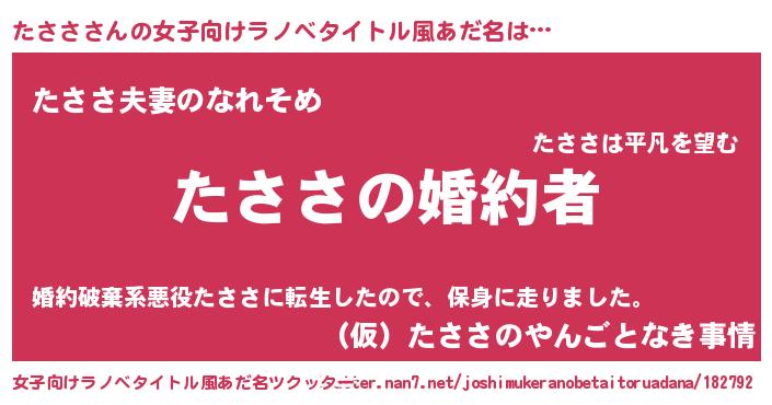 | 男性向けラノベタイトル風あだ名 | 『うちの娘の為ならば、俺はもしかしたらたささも倒せるかもしれない。』 |