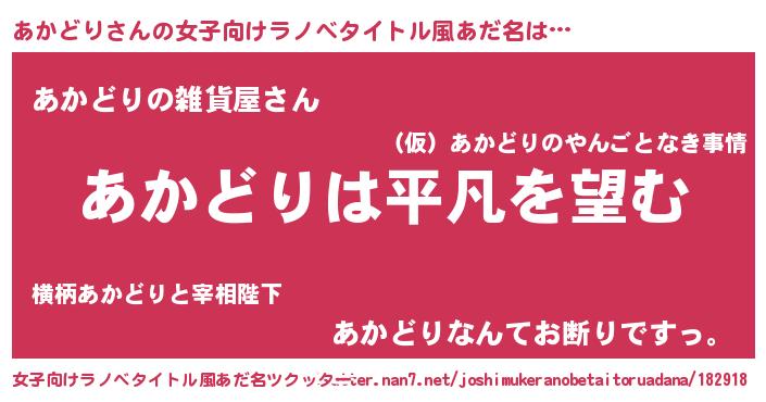 | 男性向けラノベタイトル風あだ名 | 『ダンジョンにあかどりを求めるのは間違っているだろうか』 |