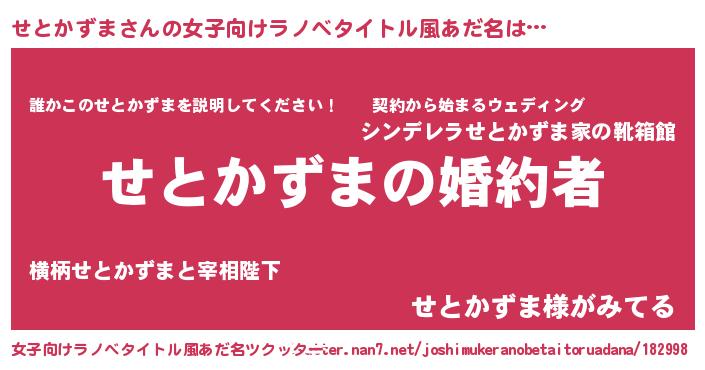 | 男性向けラノベタイトル風あだ名 | 『うちの娘の為ならば、俺はもしかしたらせとかずまも倒せるかもしれない。』 |