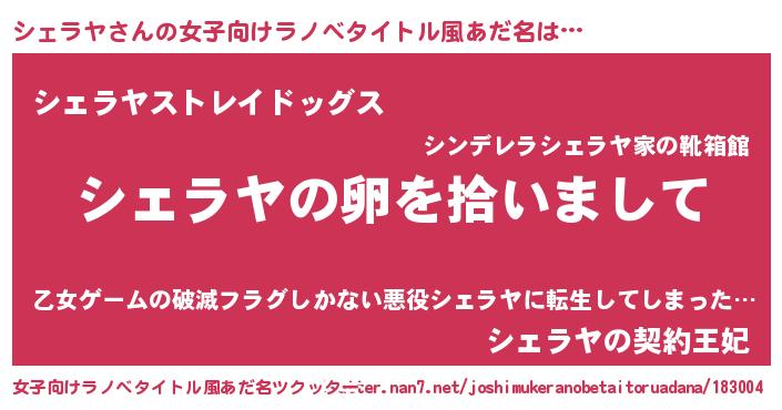 | 男性向けラノベタイトル風あだ名 | 『ダンジョンにシェラヤを求めるのは間違っているだろうか』 |