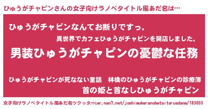 | 男性向けラノベタイトル風あだ名 | 『うちのひゅうがチャピンが世界を掌握している!』 |