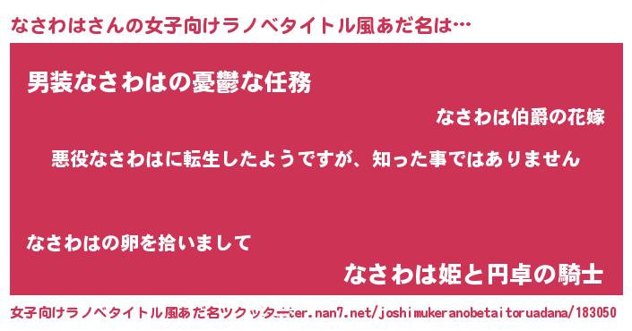 | 男性向けラノベタイトル風あだ名 | 『この素晴らしい世界になさわはを!』 |