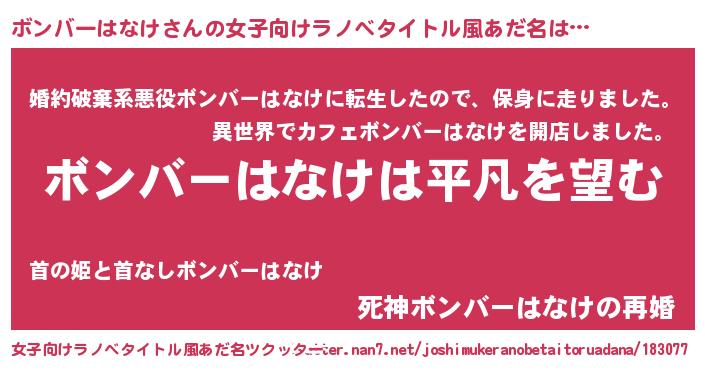 | 男性向けラノベタイトル風あだ名 | 『ダンジョンにボンバーはなけを求めるのは間違っているだろうか』 |