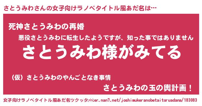 | 男性向けラノベタイトル風あだ名 | 『さとうみわの嫁は女の子じゃないと思った?』 |