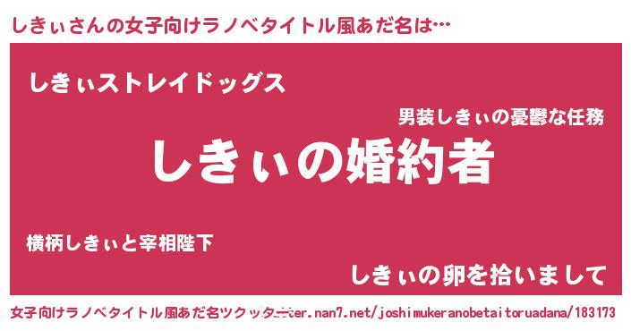 しきぃさんの女子向けラノベタイトル風あだ名は… 『しきぃの婚約者』『しきぃストレイドッグス』『しきぃの卵を拾いまして』 ツクッター #女子向けラノベタイトル風あだ名ツクッター http://tkutter.nan7.net/joshimukeranobetaitoruadana/183173/