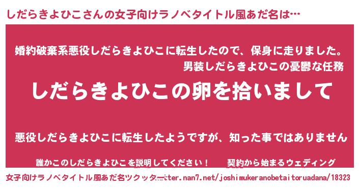 | 男性向けラノベタイトル風あだ名 | 『しだらきよひこの嫁は女の子じゃないと思った?』 |