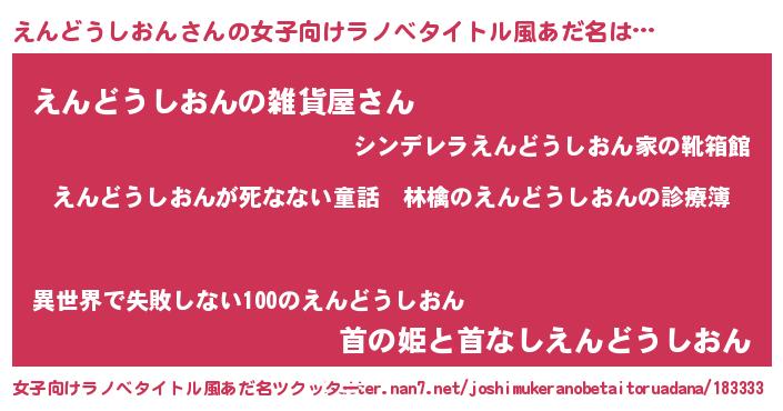 | 胡散臭い通販商品みたいなあだ名 | 『ハリウッド女優が絶賛した世界で10本だけ現存している希少なブランデー…その名も「えんどうしおん」』 |