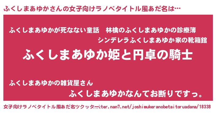 ふくしまあゆかさんの女子向けラノベタイトル風あだ名は… 『ふくしまあゆか姫と円卓の騎士』『ふくしまあゆかが死なない童話 林檎のふくしまあゆかの診療簿』『ふくしまあゆかなんてお断りですっ。』 ツクッター #女子向けラノベタイトル風あだ名ツクッター http://tkutter.nan7.net/joshimukeranobetaitoruadana/18338/