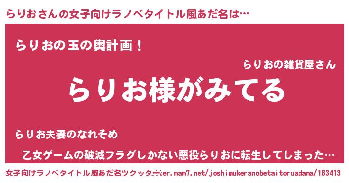 | 男性向けラノベタイトル風あだ名 | 『らりおの嫁は女の子じゃないと思った?』 |
