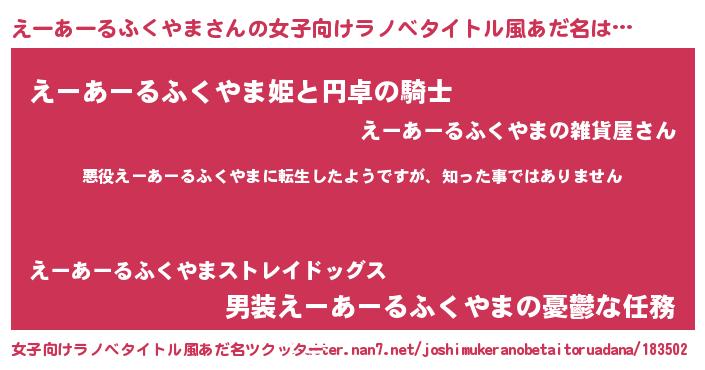| 意味不明あだ名 | 『住所不定無職えーあーるふくやま(74歳)』 |