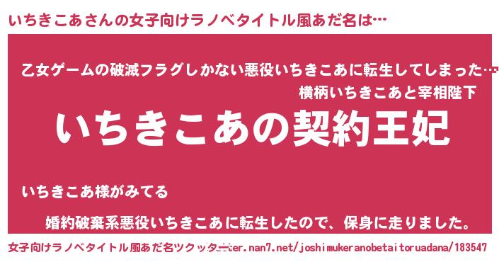 | 男性向けラノベタイトル風あだ名 | 『いちきこあという概念が存在しない退屈な世界 』 |