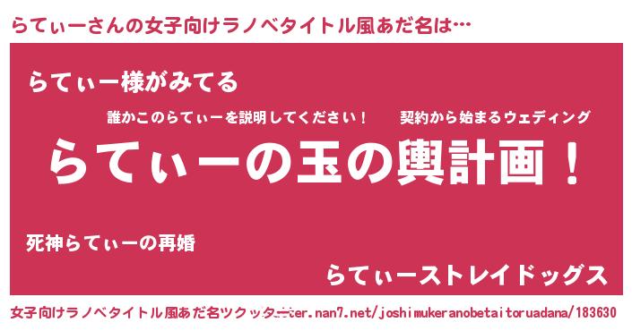 | 男性向けラノベタイトル風あだ名 | 『らてぃー~年齢イコール彼女いない歴の魔法使い~』 |