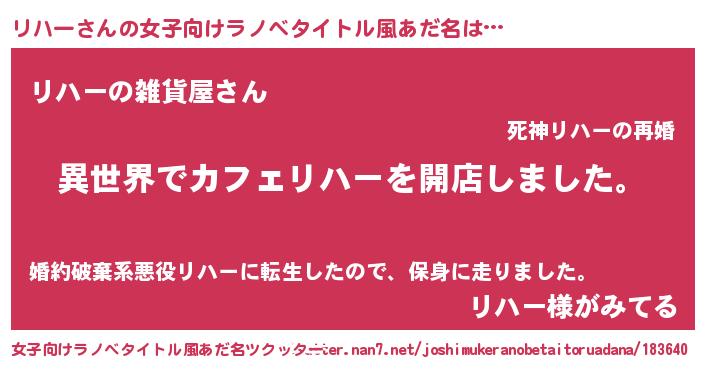| 男性向けラノベタイトル風あだ名 | 『誰もが恐れるあのリハーが、ぼくの専属メイドになるようです。』 |
