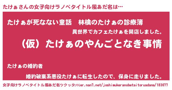 | 男性向けラノベタイトル風あだ名 | 『たけぁの憂鬱』『魔弾の王とたけぁ』 |