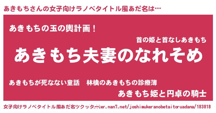 | 男性向けラノベタイトル風あだ名 | 『おまえをオタクにしてやるから、俺をあきもちにしてくれ! 』 |