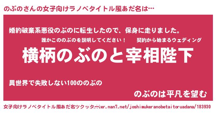 | 男性向けラノベタイトル風あだ名 | 『のぶのに滅ぼされるだけの簡単なお仕事です』 |